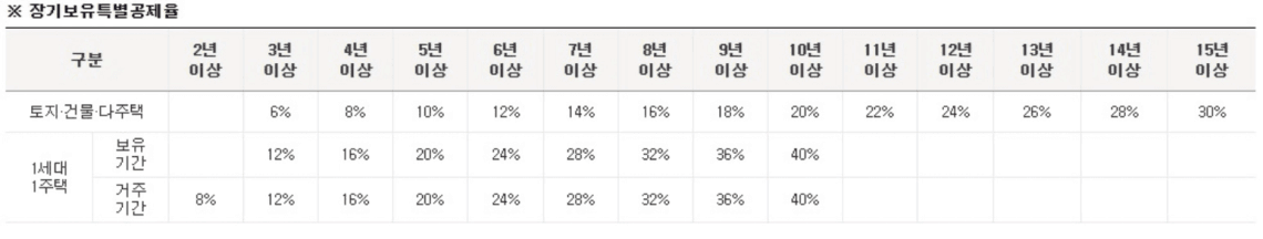 - 3년 이상 보유한 부동산에 대해 보유 기간에 따라 6%에서 최대 30%까지 공제됩니다.