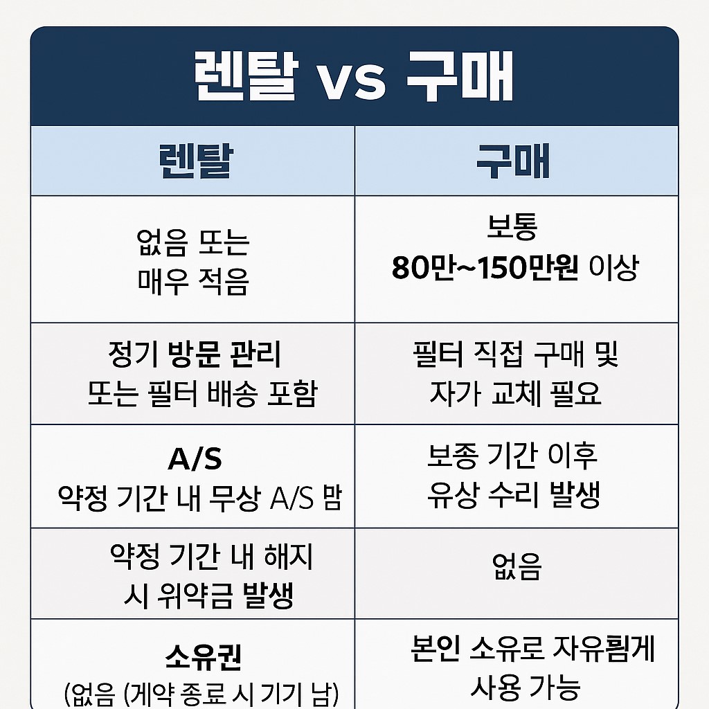 A. 단기적으로는 렌탈이 초기 부담이 적고 관리가 포함되어 유리하며, 장기적으로 보면 5년 이상 사용 시 구매가 더 저렴할 수 있습니다. 단, 필터 교체 및 A/S 관리가 스스로 가능해야 합니다.